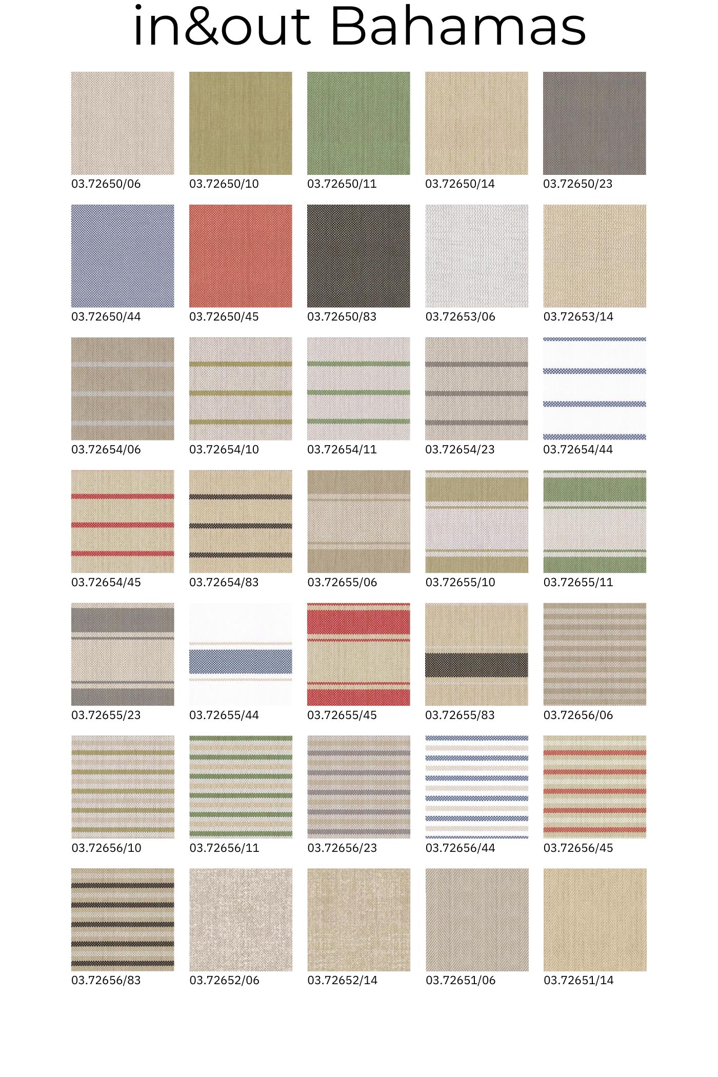 La colección Bahamas UV AntiManchas incluye una gran variedad de texturas y acabados: desde lisos con cuerpo y apariencia robusta, hasta espigas discretas o rayas decorativas. La paleta de color también está pensada para ofrecer versatilidad: blanco, beige, negro, azul marino, gris, verde, rojo o aceite, todos ellos con un aspecto natural y elegante que se integra fácilmente en terrazas, zonas lounge, hoteles, restaurantes o espacios residenciales con zonas outdoor.