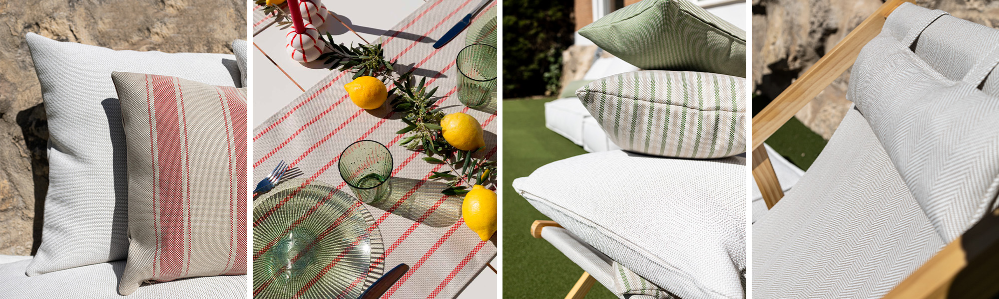 El secreto está en la materia prima: todos los tejidos de la colección están fabricados con polipropileno teñido en masa, una fibra técnica especialmente adecuada para exterior gracias a su excelente solidez a la luz, resistencia al pilling y facilidad de limpieza. El teñido en masa implica que el color se incorpora directamente durante la extrusión de la fibra, cuando aún está en estado líquido. Esto garantiza que el pigmento quede completamente integrado, evitando la pérdida de color con el tiempo, incluso tras una exposición continua al sol o a fuentes de luz artificial intensa.