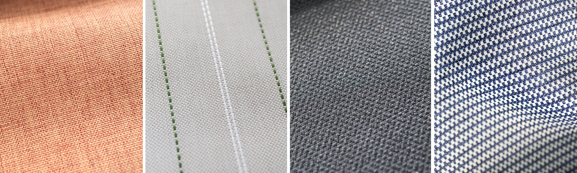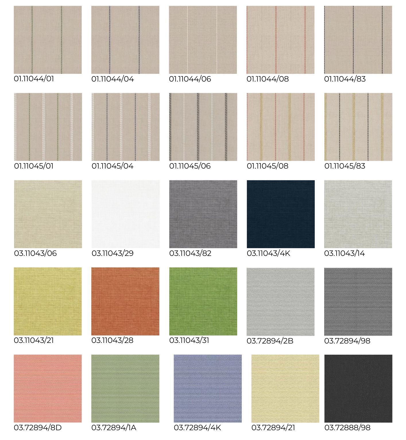 En términos de diseño, el book ofrece una paleta equilibrada y actual con tonos beige, gris, amarillo, coral,azul y negro, que se adaptan fácilmente a distintos estilos decorativos. También incluye tejidos con rayas en diferentes anchos y colores, y una amplia variedad de texturas que aportan riqueza visual y táctil al conjunto. El acabado y el tacto de estas telas las hace perfectas también para su uso en interiores, especialmente en proyectos que buscan continuidad estética entre espacios indoor y outdoor.