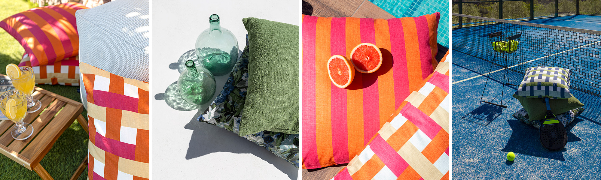 La colección in&out Calviá está formada por estampados llenos de vida, con cuatro combinaciones de color que permiten crear ambientes muy distintos: verdes intensos; azules con toques verdes; una mezcla cálida de naranjas, amarillos y rosas; y una gama más neutra en beiges, grises y negros. Las rayas y los motivos florales hacen que cada diseño tenga personalidad propia, sin renunciar a la versatilidad.